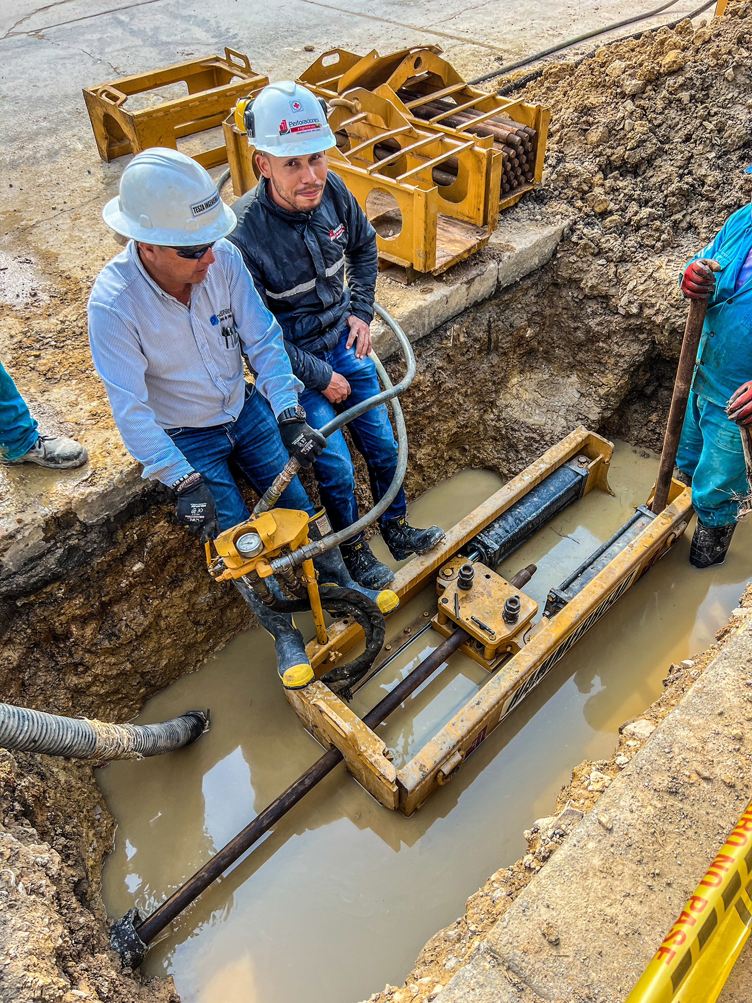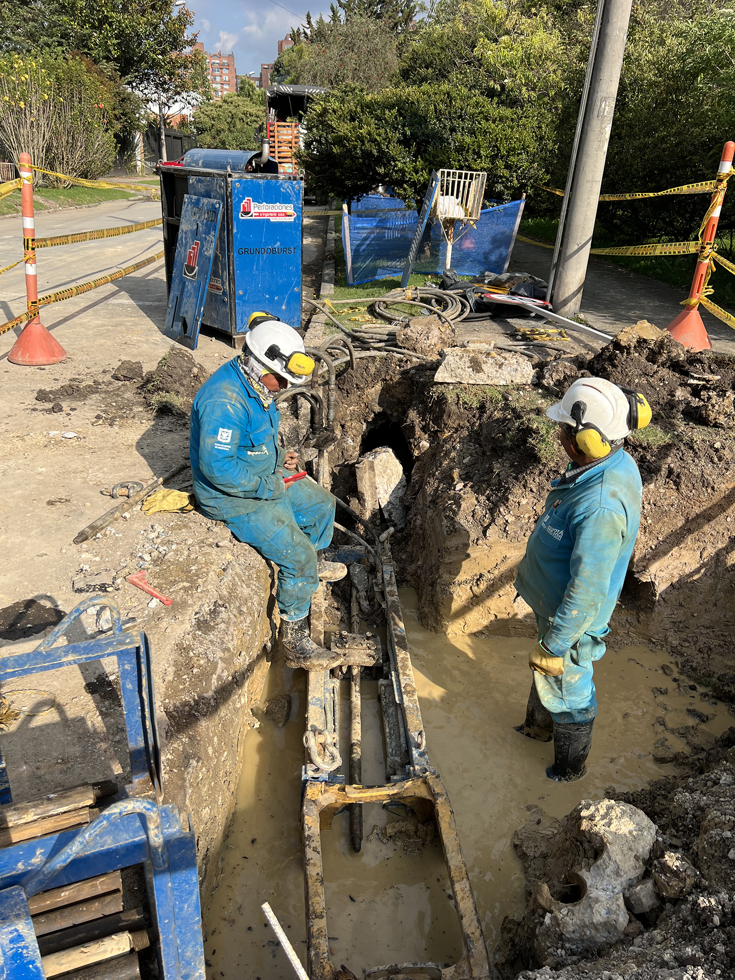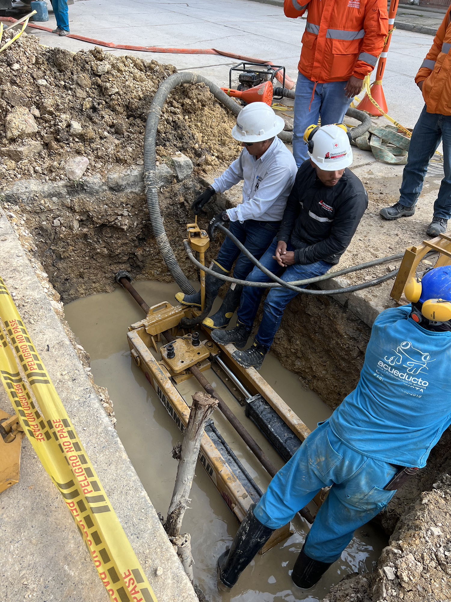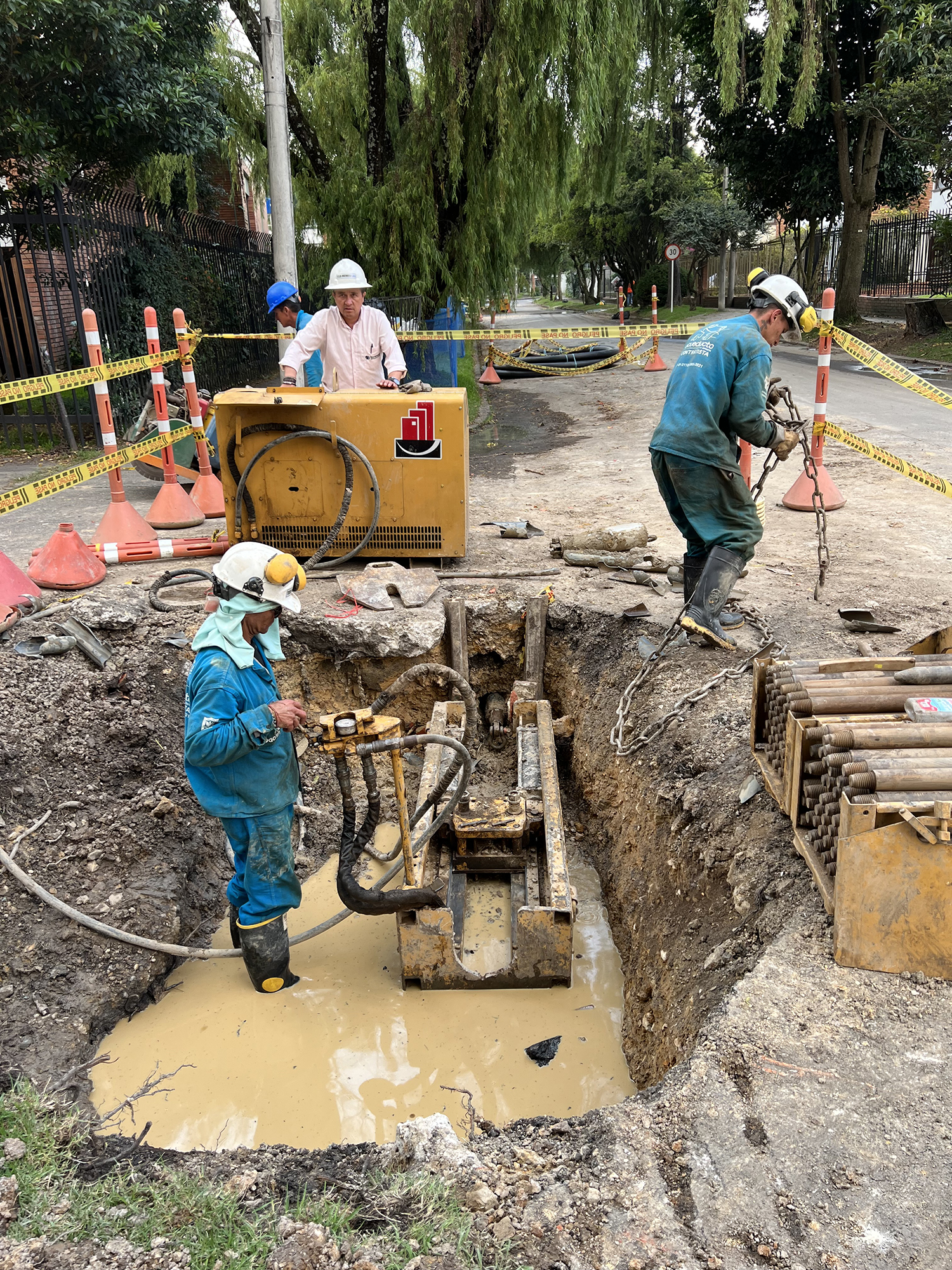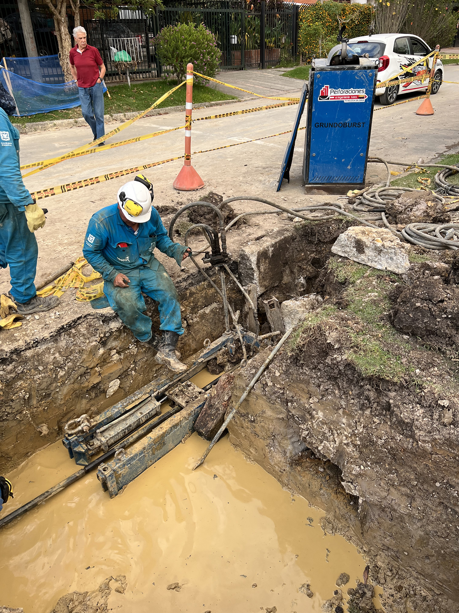 La máquina de restitución instala las varillas por dentro de la tubería a sustituir tanto para acueductos y alcantarillados en diámetros de 3″ hasta 60″, desde el pozo de inicio hasta el pozo de salida en longitudes de 80m. a 100m. Se conecta una cuchilla de corte de roca horizontalmente utilizando una en ensanchamiento de mayor diámetro del foso de salida, el tubo viejo es reventado y compactado a lo largo de la sustitución en el terreno. La tubería nueva instalada a medida que se van recogiendo el tren de varillas, permite el reemplazo de tuberías de hierro fundido, concreto, asbesto, pvc y en general materiales fractúrables por uno nuevo de polietileno del mismo diámetro o mayor, según las condiciones del subsuelo.